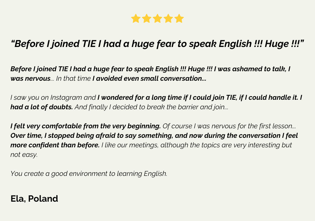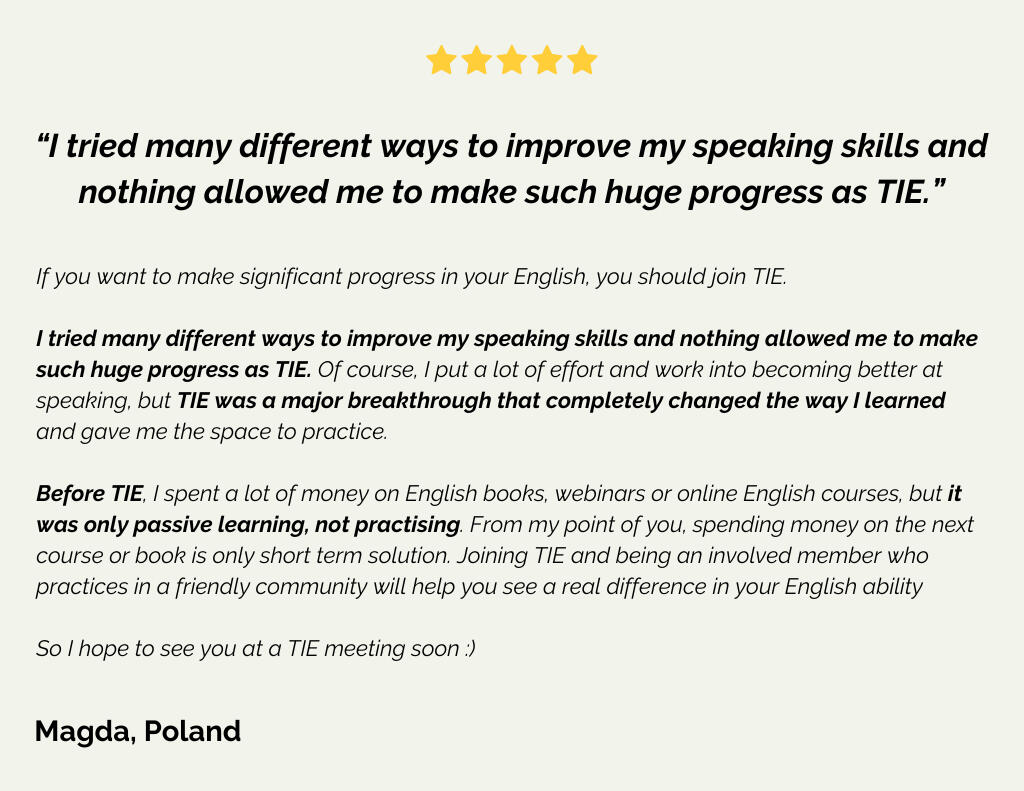 "One of the biggest concerns before joining TIE was whether it would be a real opportunity to speak when there were too many people in the small room but it turned out to be completely different.I thought that one-to-one lessons with tutor would be more helpful for me. But when I went somewhere and started speaking to other people, it turned out that I didn't understand them, because I was only used to the accent of my teacher.The fact that during our classes [in TIE] we can speak with different people from different countries with different accent and level of English, it's a real value to me.I really feel that I've improved a lot when it comes to my spoken English, and that's only because of TIE, I think."