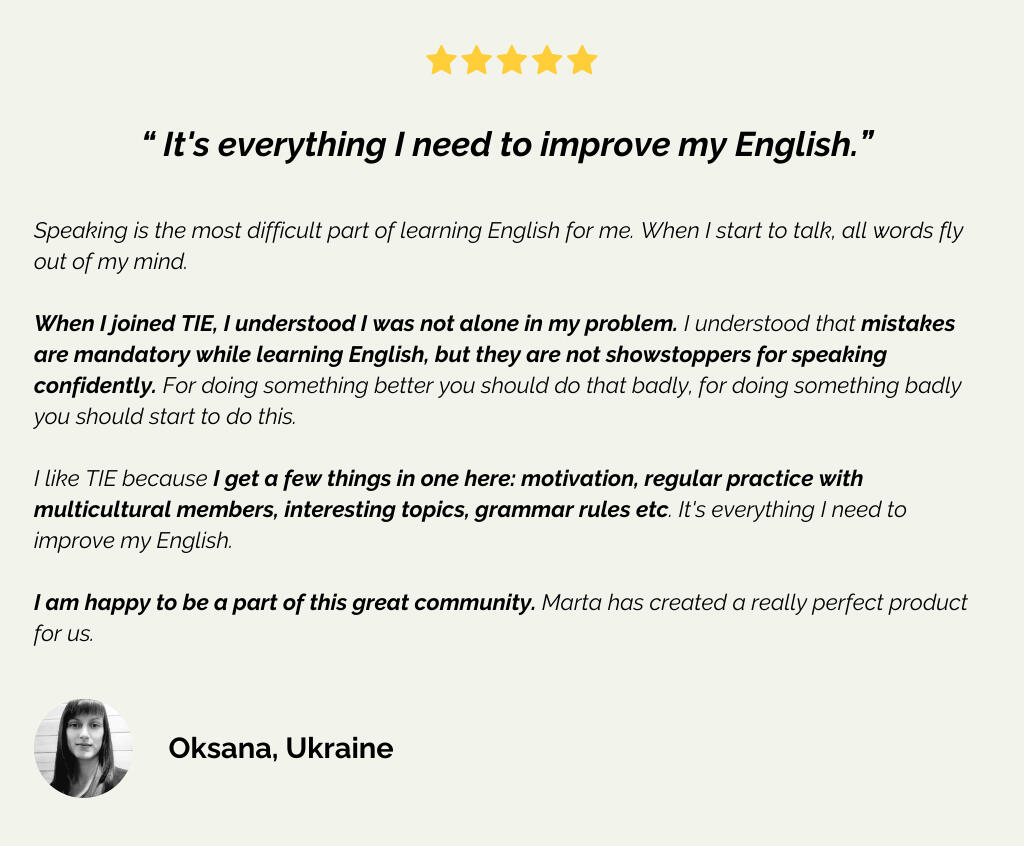 Is my English good enough to join TIE?TIE Members are B1 and higher.If you can understand me, my emails and the text on this page, your English is good enough to join TIE. If you thought, "But I can't speak very well", that's exactly who TIE is for - for people who understand a lot and can already speak, but want to take their speaking skills to a higher level.If you still have doubts, remember that you have 14-day guarantee to check if TIE is the right fit for you.