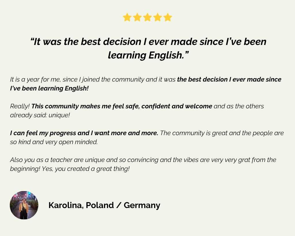 Will I get 1:1 support?You get unlimited personalized feedback from a human teacher on the tasks you complete on the platform.During the classes, I listen to as many members as possible and share feedback with the whole group on the common mistakes and key words to pay attention to.What's more, you'll have 24/7 access to our community platform, where you can always send me a direct message. I usually reply within 48 hours on weekdays.