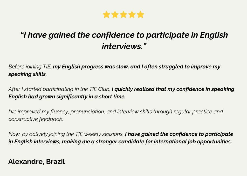 "I tried many ways to improve my speaking skills and nothing allowed me to make such huge progress as TIE.TIE was a major breakthrough that completely changed the way I learned and gave me space to practice.I used to be traumatized by speaking at work. Now, I can conduct meetings and finally focus on work, not on my English."